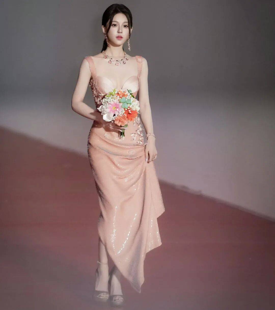 此次造型的精髓,在于那份刻意为之的“收束”与“厚重”。没有多余繁杂的装饰,没有跳跃浮夸的色彩,整体造型简约大气,却暗藏力量感,旨在传递一种超越甜美范畴的贵气与气场。这份“收束”不是拘谨,而是沉淀后的从容;这份“厚重”不是臃肿,而是气质的沉淀,让赵露思的魅力更具层次感。